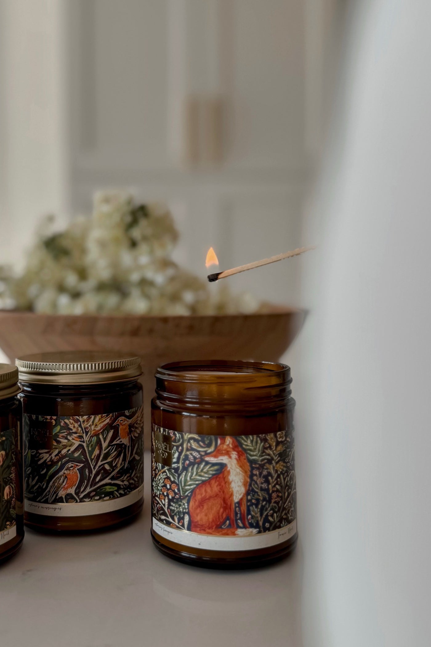 Noix de coco vierge + cire de soja, parfums premium, mèches en bois naturel.